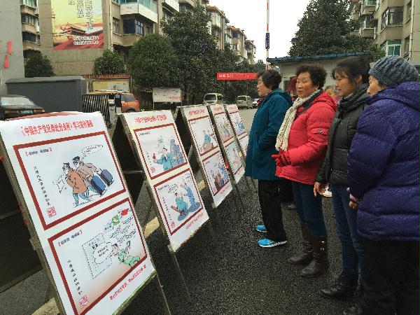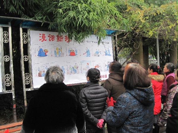 Old members of Baiyun District Community in Guiyang City are watching cartoons to learn new Regulations and Guidelines.